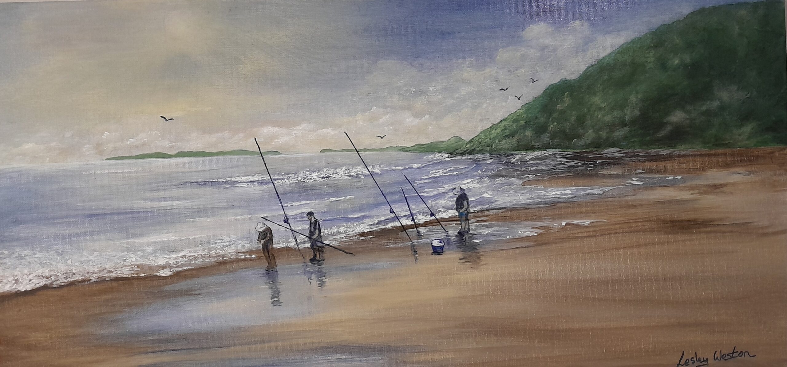 Two paintings of Matarangi Beach, the first is at the southern end, Bluff Hill, in the morning, and the second is the northern end in the evening.